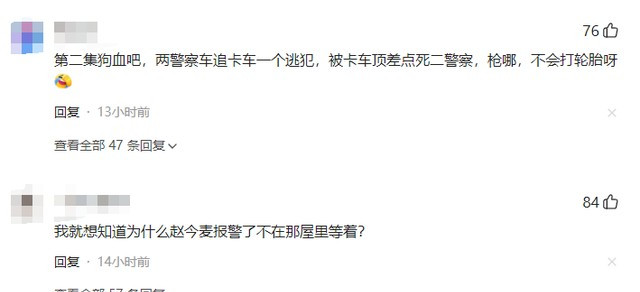 首先就是有网友觉得的第二集已经超出了人类的正常行为,两个警察追开着卡车的逃犯,还差点被卡车顶死,按理说这个时候就已经掏枪打轮胎,让车强行停下来。